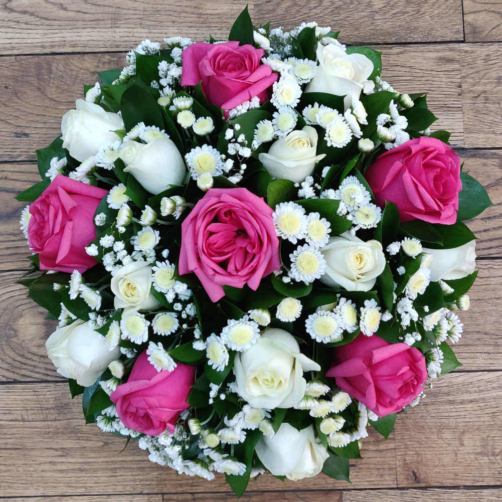 A mix of pink and white roses interspersed with gypsophila and green foliage.