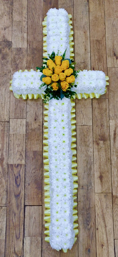 A white chrysanthemum cross with a yellow rose spray edged in yellow ribbon. The spray and ribbon can be changed to a colour of your choice.