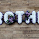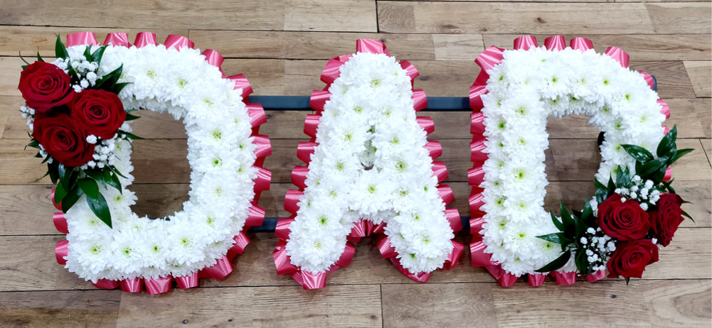White chrysanthemums with red and white sprays, edged in red ribbon. Sprays and ribbon can be matched to your colour choice.