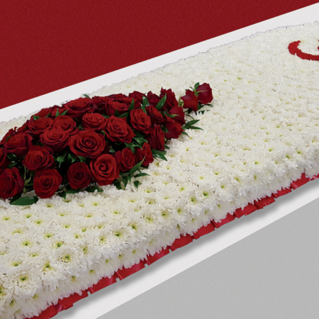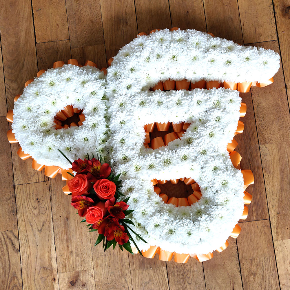 White chrysanthemums with an orange ribbon and an orange rose spray. Ribbon and spray can be changed to a colour of your choice.