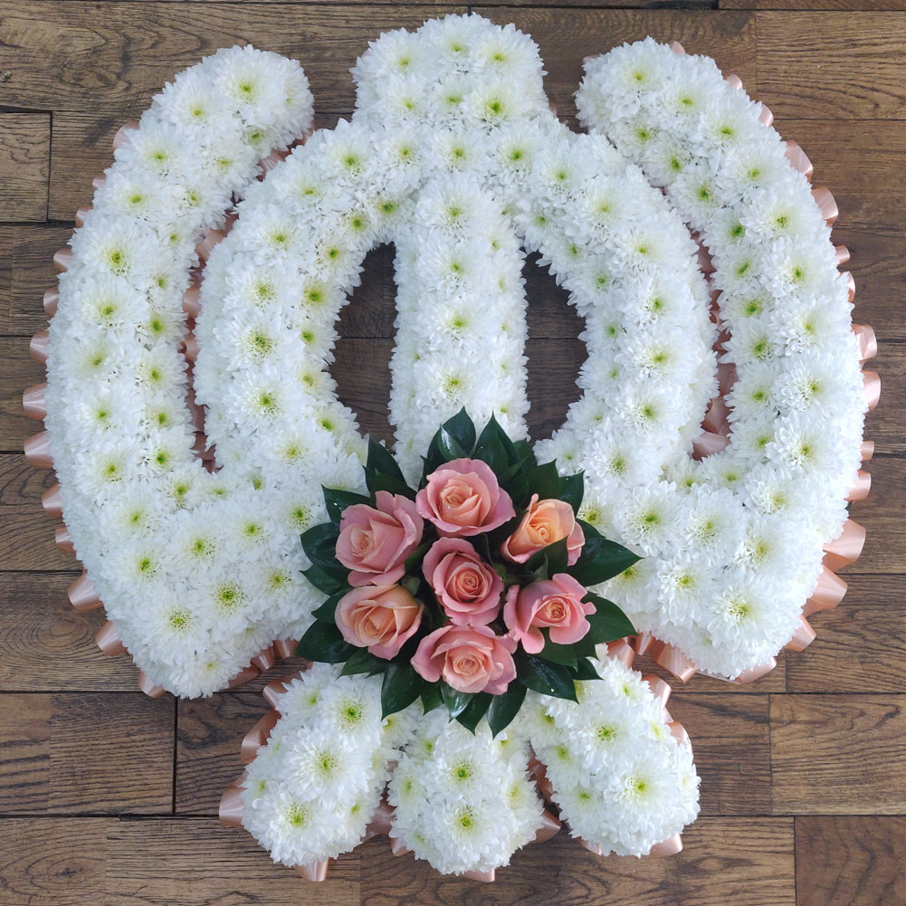 White chrysanthemums with a mix of purple and white flowers, edged with a purple ribbon. Available with or without ribbon in a choice of colours.