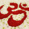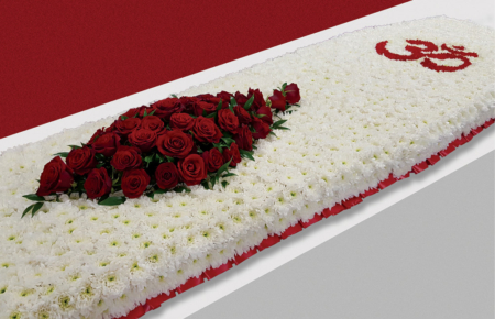 This beautiful tribute completely covers the coffin top in white chrysanthemums. It is shown here with a handcrafted Aum, a beautiful spray of red roses and edged with red ribbon. The symbol and the colours can be changed to match your requirements.