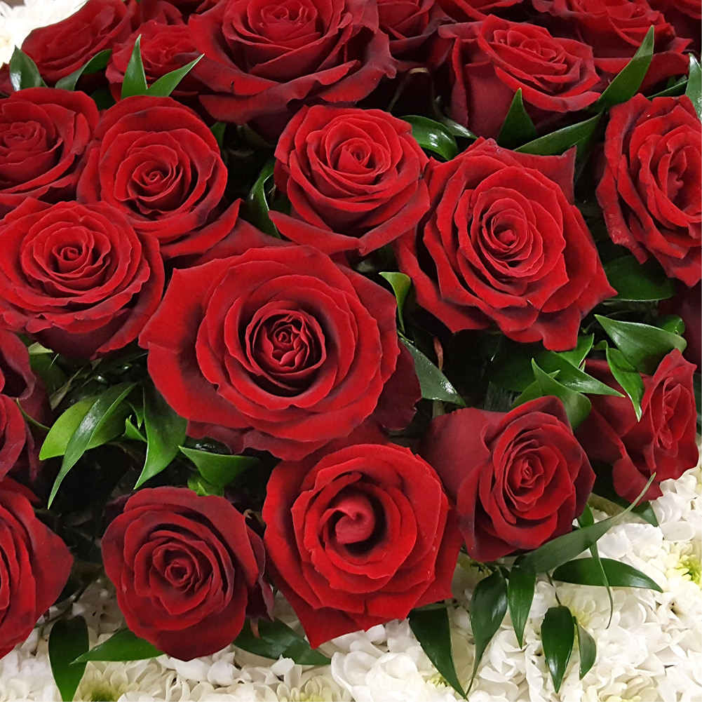 This beautiful tribute completely covers the coffin top in white chrysanthemums. It is shown here with a handcrafted Aum, a beautiful spray of red roses and edged with red ribbon. The symbol and the colours can be changed to match your requirements.