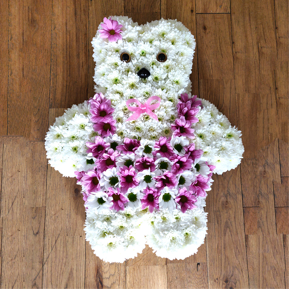 A girl teddy in white double-headed chrysanthemums dressed in pink carnations and finished off with pretty ribbons.