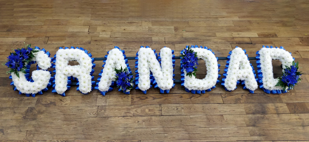 White chrysanthemums with blue sprays edged in a blue ribbon. The sprays and ribbon can be changed to colour of your choice.