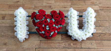 White chrysanthemums edged in white lace ribbon with a beautiful red roses heart. Heart, letters and ribbon can be changed to a colour of your choice.