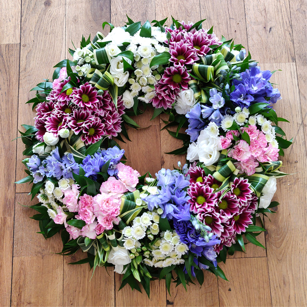 A delicate wreath of mixed white and purple chrysanthemums and delphiniums with lush greenery.