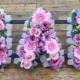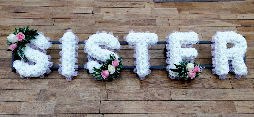 White chrysanthemums edged in laced ribbon with beautiful pink and white rose sprays. Sprays and ribbons can be changed to a colour of your choice.