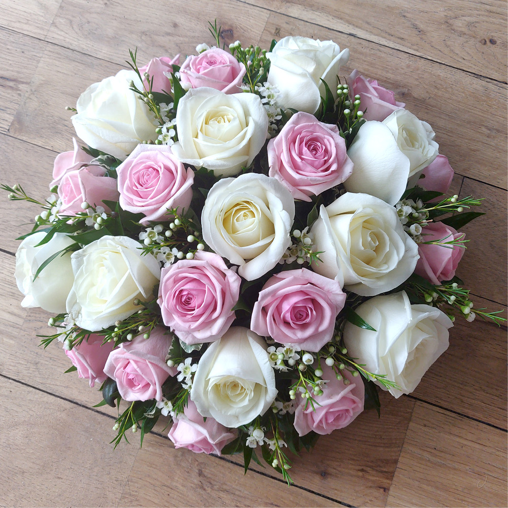 A round posy of pale pink and white roses.